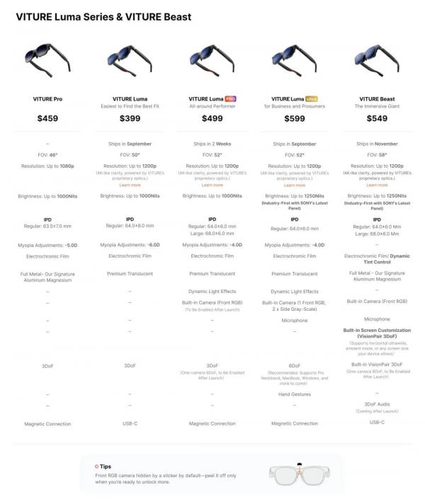 VITURE Luma(400美元)、Luma Pro(500美元)和Luma Ultra(600美元)预计均可在下单后两周内发货,而下一款设备Luma Beast(550美元)计划于11月发货。