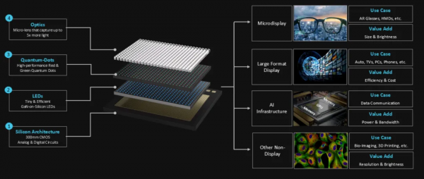 平台建立在三个核心能力上。材料层面,亚微米级蓝色MicroLED加高性能量子点墨水,实现长期稳定性。器件层面,优化的CMOS背板、晶圆级混合键合、定制微透镜阵列。制造层面,基于300mm氮化镓硅基工艺,专为大规模量产设计。