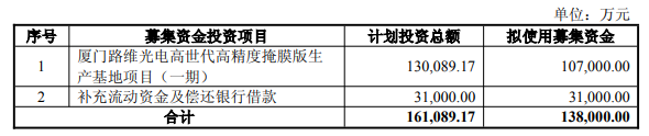 1月21日晚间,路维光电发布公告,拟定增募资不超13.8亿元,用于厦门路维光电高世代高精度掩膜版生产基地项目(一期)、补充流动资金及偿还银行借款。