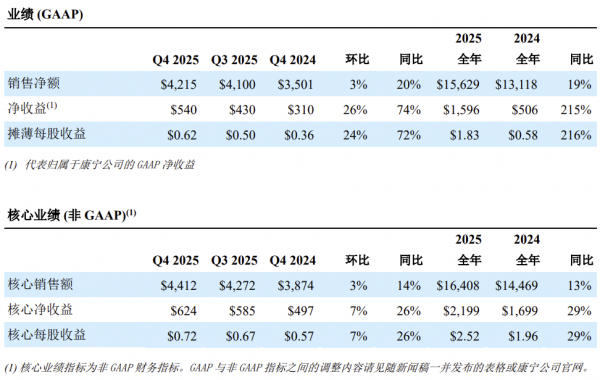 • GAAP 销售额为 42.2 亿美元。核心销售额为 44.1 亿美元,同比增长 14%。• GAAP 每股收益为 0.62 美元。核心每股收益为 0.72 美元,同比增长 26%。GAAP 与核心每股收益之间的差异主要反映了与公司收益合同折算和外币债务折算相关的非现金、按市值计价的调整,同时也反映了恒定汇率的调整。• GAAP 毛利率为 35.5%。核心毛利率为 38.1%。• GAAP 运营利润率为 15.9%。核心运营利润率为 20.2%。• GAAP 运营现金流为 10.5 亿美元,调整后的自由现金流为 7.32 亿美元。