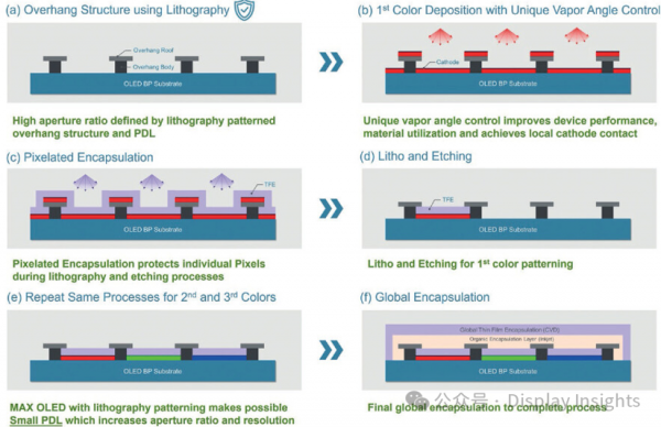 图2. MAX OLED图案化工艺展示:(a) 通过光刻工艺制造的悬垂结构;(b) 具有独特蒸镀角度控制的第一颜色沉积;(c) 像素化封装;(d) 光刻和蚀刻工艺;(e) 对第二和第三颜色重复相同工艺;(f) 全局封装工艺后的MAX OLED像素架构