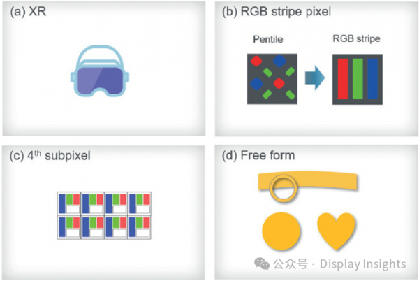 图7. MAX OLED技术支持的新应用包括:(a) 扩展现实显示;(b) RGB条形像素;(c) 可用于UPC或传感器集成的第四子像素;(d) 自由形态显示
