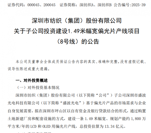 10月15,深纺织A(000045.SZ)公告,公司控股子公司深圳市盛波光电科技有限公司(简称“盛波光电”)拟投资建设一条1.49米幅宽偏光片产线项目(8号线)(简称“8号线项目”)。