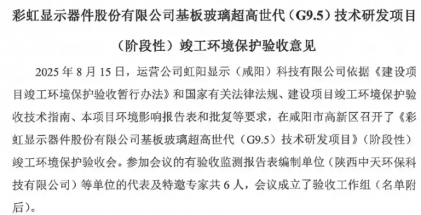 据寻标宝网站显示,2025年8月15日,运营公司虹阳显示依据《建设项目竣工环境保护验收暂行办法》和国家有关法律法规、建设项目竣工环境保护验收技术指南、本项目环境影响报告表和批复等要求,在咸阳市高新区召开了《彩虹显示器件股份有限公司基板玻璃超高世代(G9.5)技术研发项目》(阶段性)竣工环境保护验收会。