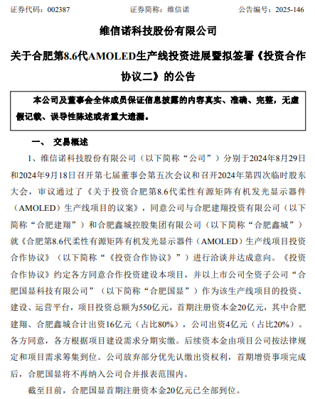 维信诺科技股份有限公司(以下简称“公司”)分别于2024年8月29日和2024年9月18日召开第七届董事会第五次会议和召开2024年第四次临时股东大会,审议通过了《关于投资合肥第8.6代柔性有源矩阵有机发光显示器件(AMOLED)生产线项目的议案》,同意公司与合肥建翔投资有限公司(以下简称“合肥建翔”)和合肥鑫城控股集团有限公司(以下简称“合肥鑫城”)就《合肥第8.6代柔性有源矩阵有机发光显示器件(AMOLED)生产线项目投资合作协议》(以下简称“《投资合作协议》”)进行洽谈并达成意向。《投资合作协议》约定各方同意合作投资建设本项目,并以上市公司全资子公司“合肥国显科技有限公司”(以下简称“合肥国显”)作为该生产线项目的投资、建设、运营平台,项目投资总额为550亿元,首期注册资本金20亿元,其中合肥建翔、合肥鑫城合计出资16亿元(占比80%),公司出资4亿元(占比20%)。
