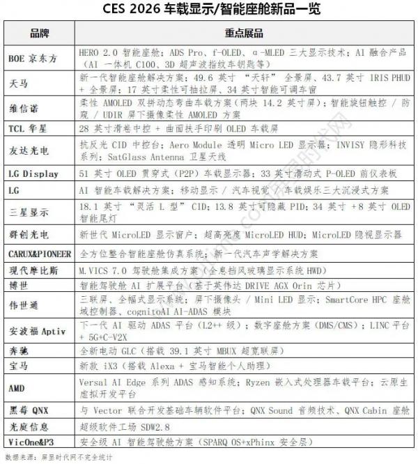 随着汽车从单纯交通工具向智能生活空间转型,自动驾驶与软件定义汽车(SDV)进程持续提速,车载场景需承载的信息与内容量呈爆发式增长。在此背景下,2026 年国际消费电子展(CES 2026)已从消费电子秀场升级为汽车技术革新核心舞台,汽车显示技术则跃升为智能座舱领域的核心竞争要素 —— 显示屏不再是简单终端,更成为定义车内架构与用户体验的关键支撑。京东方、天马、维信诺、TCL华星、友达、群创、LG、现代摩比斯、奔驰、宝马等 20 余家企业集中亮出重磅技术方案,勾勒出智能座舱显示技术的未来演进蓝图。