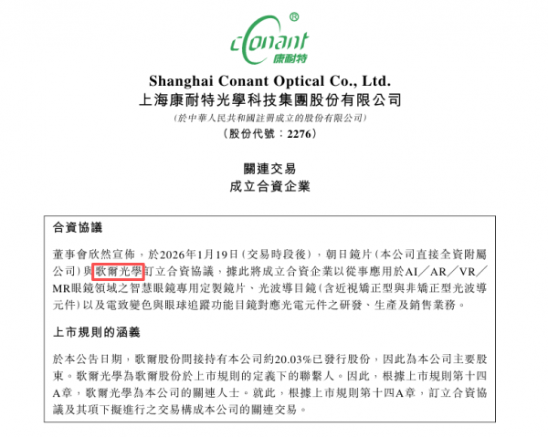 1 月 19 日晚间,歌尔光学科技 (香港) 有限公司(下称 “歌尔光学”)与上海康耐特光学科技集团股份有限公司旗下全资子公司朝日镜片控股有限公司(下称 “朝日镜片”)正式签署合资协议,宣布共同成立歌尔光视科技 (香港) 有限公司,聚焦 AI/AR/VR/MR 眼镜领域核心光学元件的研发、生产与销售,歌尔光学以 70% 持股比例主导此次合作,彰显其在新兴光学赛道的战略布局决心。