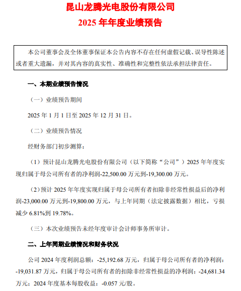 1月30日,龙腾光电公告,预计昆山龙腾光电股份有限公司(以下简称“公司”)2025年年度实现归属于母公司所有者的净利润-22,500.00万元到-19,300.00万元。