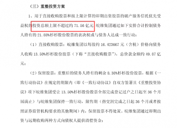 资料显示,杉杉股份专注于偏光片业务和锂电池负极材料的发展,是国内第一家从事锂离子电池人造石墨负极材料研发、生产企业,在锂电池材料领域已有20多年的研发和产业化生产实践。2021年,杉杉股份通过收购LG化学LCD偏光片业务成为全球偏光片龙头,形成双主业格局。回溯此次重整历程,杉杉集团与朋泽贸易早在 2025 年 3 月 20 日便被宁波市鄞州区人民法院裁定实质合并重整,后于 2025 年 11 月 7 日解除此前重整投资协议并重启投资人招募。经严格遴选,皖维集团、海螺集团与宁波金资组成的联合体脱颖而出,其中皖维集团与宁波金资成为最终重整投资人。值得关注的是,目前海螺集团正与皖维集团推进重组事宜,重组完成后海螺集团将成为皖维集团控股股东,不过皖维集团的实际控制人仍为安徽省国资委,这也意味着杉杉股份的实控权最终将归属安徽省国资委。此次重整的核心投资方案围绕杉杉股份股权展开,投资总额上限不超过约 71.56 亿元,皖维集团将通过直接收购 + 一致行动的方式,合计控制杉杉股份 21.88% 的股票表决权,牢牢掌握公司控制权。具体来看,皖维集团将以每股约 16.423667 元的价格,直接收购杉杉集团及朋泽贸易持有的 13.50% 杉杉股份股票,对应总价款约 49.87 亿元;对于重整后债务人持有的剩余 8.38% 杉杉股份股票,皖维集团将与债务人签订《一致行动协议》,在 36 个月内保持一致行动,且该部分股票在限售期内不得处置。