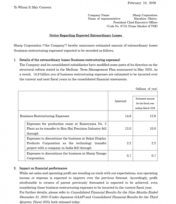2月10日,夏普发布官方公告,披露因对 2025 年 5 月公布的中期经营计划中结构改革方向作出部分调整,公司及其合并子公司预计在本财年(截至 2026 年 3 月)和下一财年合计产生 149 亿日元(约合人民币6.64亿元)特别损失(业务重组费用),其中本财年预计计提 129 亿日元(约合人民币5.75亿元)。