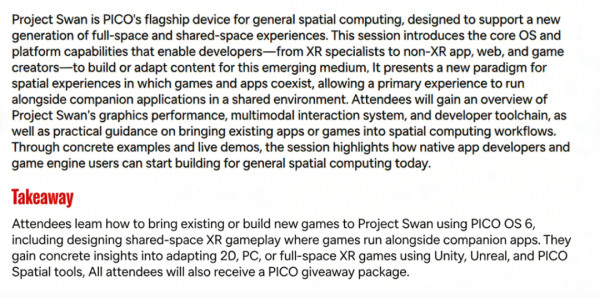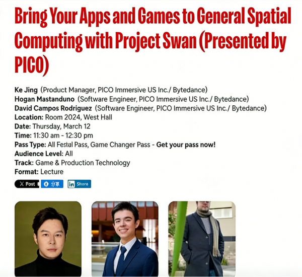 据介绍,此次 Pico 将详解 Project Swan 基于 PICO OS 6 的核心平台能力,同时现场展示这款设备的图形性能、多模态交互系统及开发者工具链。从GDC官网披露的信息来看,这场分享并非单纯的产品发布,更像是一次面向全球开发者的技术交底 , 现场会通过实例和实机演示,指导开发者如何将 2D、PC 端游戏或全空间 XR 内容,适配到 Project Swan 的空间计算场景中,甚至还会讲解 Unity、Unreal 等主流引擎与Pico Spatial 工具的结合使用。
