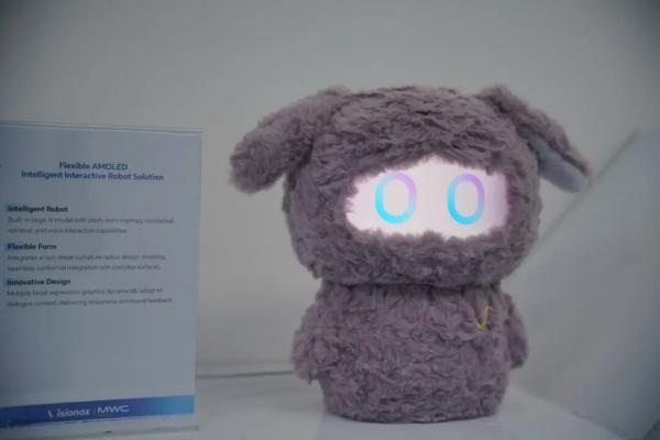 维信诺展示的柔性AMOLED智能交互机器人,搭载6.7英寸柔性AMOLED屏幕,轻拍头部即可唤醒;交流过程中,“面部”可呈现微笑、眨眼、好奇等拟人化表情;即使在AOD息屏状态下,也能维持基础表情,实现安静陪伴。屏幕从被观看走向可交流,成为连接用户与智能系统的情感入口。