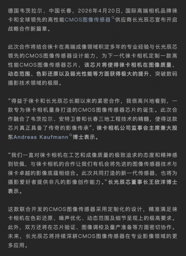 没想到长光辰芯这次是与Leica宣布了合作,下一代的高性能CMOS,可以期待一下。