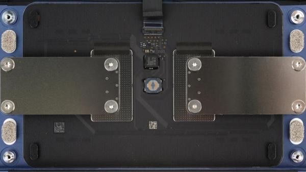 两个柔性铰链让触控板可以移动,而中央螺丝则控制着下方薄膜开关的触发力度。它比 Force Touch 更容易理解,也更容易维护,而且几乎可以肯定生产成本更低。
