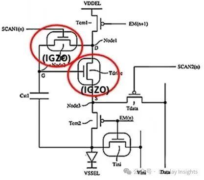 (图示标注:VDDEL、Tcml EM (n+1)、SCANt (e)、Nodel (IGZO)、SCAN2 (a) (ICZO)、Node3、Cs1 Tdata、EM (n)、Tini、VSSEL Vini Data)LTPO + 补偿电路专利(来源:苹果)