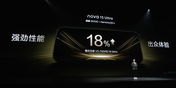 华为介绍,在麒麟9010s和最新鸿蒙HarmonyOS 6的加持下,华为nova 15 Ultra整机性能相比上代nova 14 Ultra大幅提升了18%。,游戏帧率稳定性提升 50%,软硬芯融合调度支持秒启秒开秒加载特性。