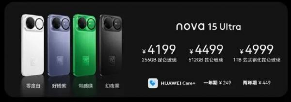 价格方面,华为nova 15 Ultra提供三种存储规格:256GB售价4199元,512GB售价4499元,1TB顶配版售价4999元。
