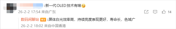 在网友追问新一代OLED技术有何提升时,该博主回应称,新屏幕具备更高的屏体白光效率,在持续亮度表现、显示寿命和色域覆盖方面均有明显提升。