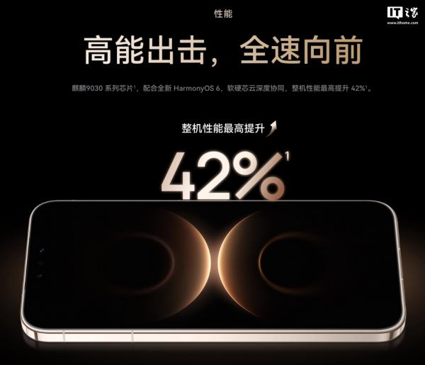 官网信息显示,华为 Mate 80 Pro 手机 16GB 规格搭载麒麟 9030 Pro 处理器,整机性能对比 HarmonyOS 4.3 出厂版本的 Mate 70 Pro(16GB 规格)最高提升 42%。