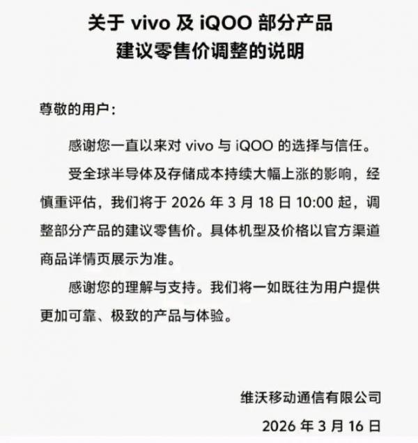 3月16日,国产智能手机大厂vivo发布《关于vivo及iQOO 部分产品建议零售价调整的说明》称,受全球半导体及存储成本持续大幅上涨的影响,经慎重评估,将于2026年3月18日10:00起,调整部分产品的建议零售价,具体机型及价格以官方渠道商品详情页展示为准。