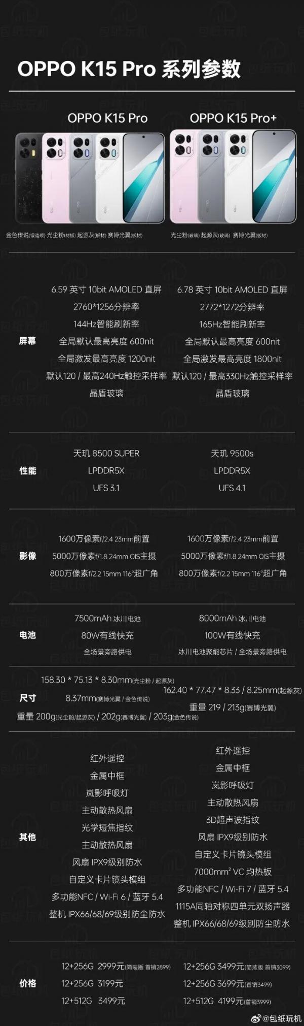 另外,OPPO K15 Pro提供赛博光翼、起源灰、光尘粉、金色传说四款配色,OPPO K15 Pro+则提供赛博光翼、起源灰、光尘粉三款。