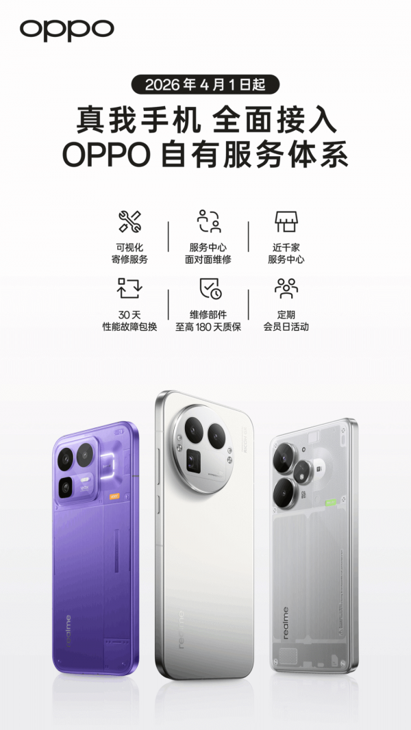 OPPO正式宣布,自2026年4月1日起,realme将全面接入OPPO售后服务网络,realme用户原有售后权益基本保持不变,同时享受更优质的服务升级。