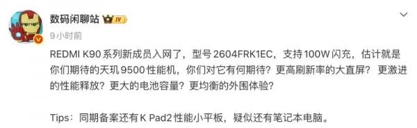 按照爆料中的说法来看,这款新机预计是天玑9500性能机,具体的机型应该就是曝光已久的REDMI K90 至尊版。