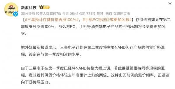 上个月,新浪科技的一份报道中也提到了相关信息,即“三星电子计划在第二季度将主要NAND闪存产品的供货价格涨幅,设定在与第一季度相近的水平。”