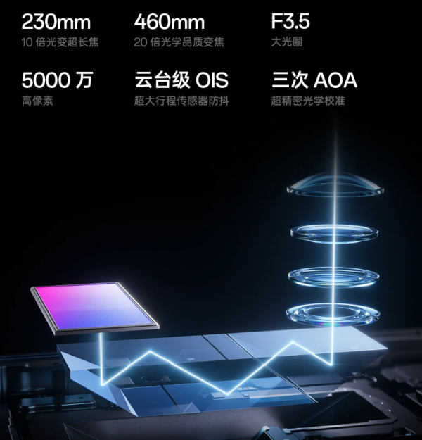 0.6× 14mm(5000万像素) 1× 23mm(2亿像素,1/1.12英寸大底) 3× 70mm(2亿像素,1/1.28英寸大底) 10× 230mm(5000万像素,五反射潜望棱镜)。