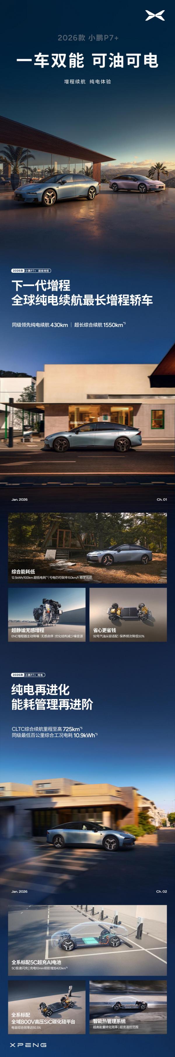 IT 之家 1 月 8 日消息,2026 款小鹏 P7+ 上市,共推出四款配置车型,提供纯电和增程两种动力形式。新车搭载第二代 VLA 技术,有效算力达到 2250TOPS,指导价为 18.68 万至 19.88 万元。