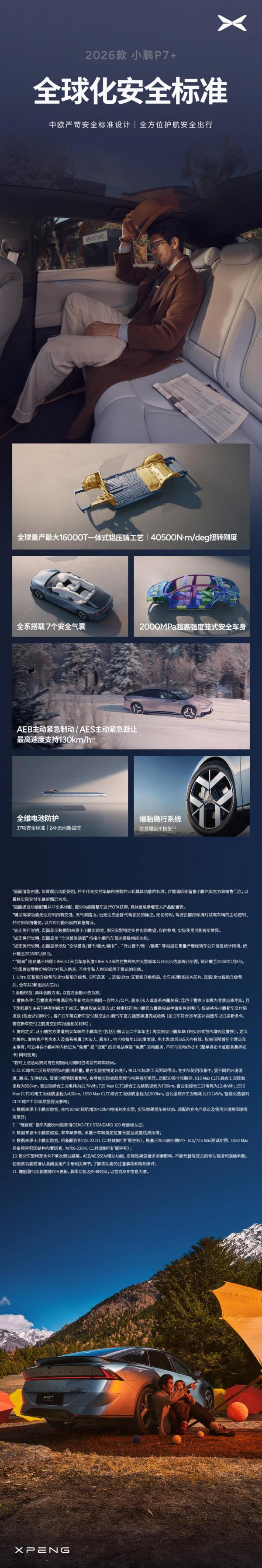 车内配置方面,2026 款小鹏 P7+ 车顶配备一体式穹顶全景天幕,尾门采用电动掀背式设计,后备厢容积在二排放倒后可扩展至 2200 升以上。车内标配母婴级环保材料、Microfiber 超纤绒顶棚、前排双层隔音玻璃及后排隐私玻璃。舒适性配置包括前排静音电吸门、电容感应方向盘、方向盘加热、前排座椅通风加热按摩及主驾座椅记忆等功能。高配车型还增加了 Nappa 真皮座椅、后排座椅电动调节、通风加热按摩功能、副驾后折叠桌板、智能香氛系统及 9 英寸流媒体内后视镜等豪华配置。信息娱乐系统标配 20 扬声器 Xopera 音响、双 50W 无线快充等。
