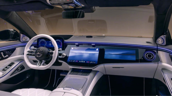 同时,新一代micro-LED数字大灯成为标配,搭载高分辨率芯片,照明范围扩大约40%,可实现600米超远距照明。车尾尾灯组焕新,左右两侧各配备三枚三叉星徽光源,与奔驰E级形成差异化区分。