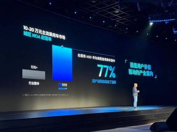 余凯介绍,10-20万主流乘用车市场中城市NOA的覆盖率非常低,但是地平线HSD的选配率达到了77%,余凯认为这是用户价值驱动的产业重构。