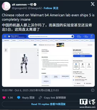 社交媒体 X 平台(原 Twitter)用户 @geogod42 发布商品截图并评论称:“中国的机器人都上沃尔玛了,而美国的实验室甚至还没寄出 5 台,这简直太离谱了。”