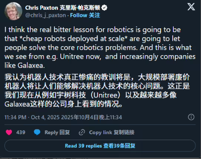 知名机器人研究员克里斯・帕克森(Chris Paxton)在转发相关帖子时评论道:“我认为机器人技术真正惨痛的教训将是,大规模部署廉价机器人将让人们能够解决机器人技术的核心问题。这正是我们现在从例如宇树科技以及越来越多像 Galaxea 这样的公司身上看到的情况。。”