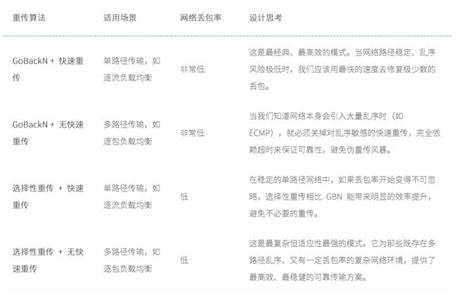 在多路径传输下,对”丢包”的判断必须更加审慎和智能。强行套用一个”一刀切”的方案是行不通的。因此,我们没有设计一个万能的重传算法,而是将重传的决策权交还给用户,由两个维度的选择构成: