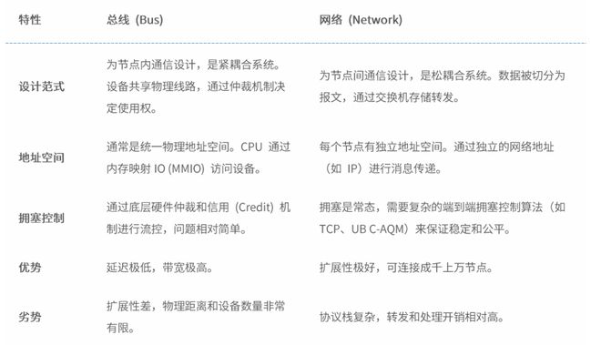 要理解 UB 的设计哲学,就需要理解总线和网络的根本区别。当然,我们不应陷入抠概念的辩经,现代的总线(如 PCIe)也借鉴了网络的交换思想,但从设计目标和应用规模上看,它们的范式差异是显著的。