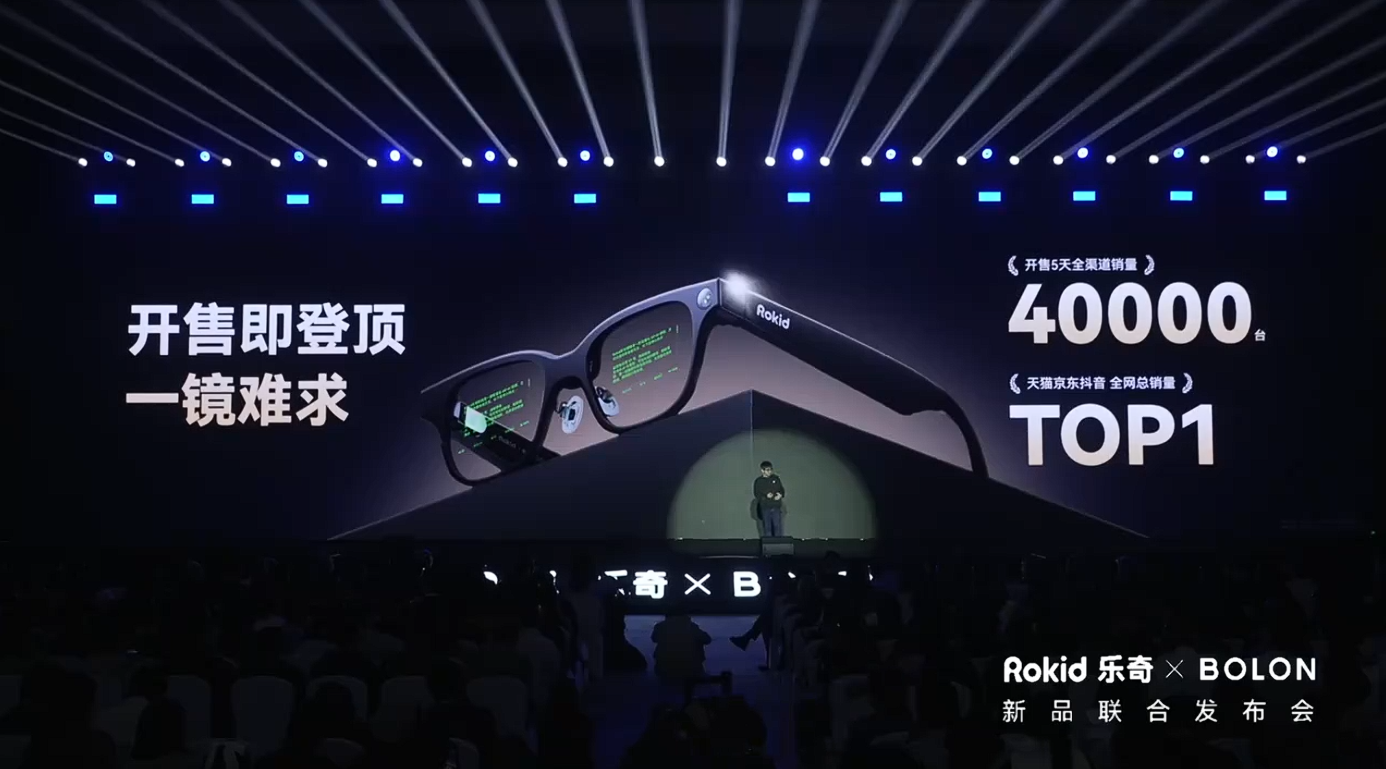 Rokid 官方公布数据:Rokid 乐奇眼镜开售即登顶,开售 5 天全渠道销量 40000 台;天猫 / 京东 / 抖音全网总销量 TOP1。另外,Rokid 乐奇眼镜累计被使用超 15,000,000 次、单台日均佩戴时长近 8 小时。