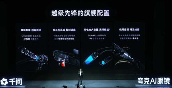 硬件配置是夸克AI眼镜 G1 的一大亮点。它搭载了高通AR1和恒玄BES2800双芯片,配合双系统智能调度机制,可根据不同场景动态分配资源,平衡性能与功耗需求。