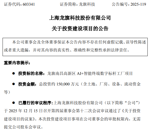 公告显示,龙旗科技于2025年12月15日召开第四届董事会第十二次会议审议通过了《关于投资建设项目的议案》。本次投资建设项目事项在公司董事会的审批权限内,无需提交公司股东会审议。