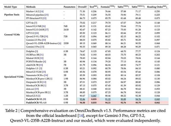 技术文档内容显示,PaddleOCR-VL-1.5 基于文心大模型进行开发,在 OmniDocBench V1.5文档解析基准上实现了 94.5%的最新最先进(SOTA)准确率,在文本、公式、表格、阅读顺序所有子任务上均领先。