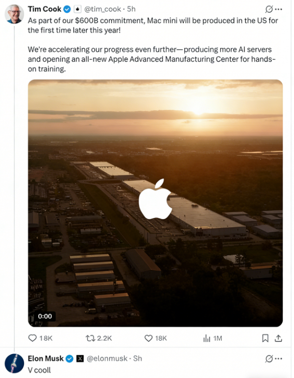 2月25日早间消息,苹果公司CEO蒂姆·库克在社交平台X上发文宣布,作为公司6000亿美元美国投资计划的一部分,Mac mini将于今年晚些时候首次在美国进行生产。库克同时表示,苹果正进一步加快相关布局,包括生产更多AI服务器,并开设一家全新的苹果先进制造中心,用于提供实践培训,持续推进美国本土制造能力的提升。