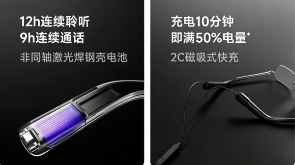 搭载非同轴激光焊钢壳电池,磁吸式快充,10分钟充50%。官方承诺:重度使用下通话2小时、音视频播放2小时及8小时以上待机。
