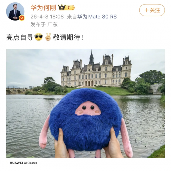 4 月 8 日,华为终端 BG CEO 何刚在微博发了一张实拍照片,左下角水印标注 "HUAWEI AI Glasses"。这是华为 AI 眼镜首次出现带摄像头的照片证据。从水印可以看出,这款眼镜的定位和 Meta Ray-Ban 类似,是一款带摄像头的无屏幕智能眼镜,摄像头模组位于镜框一侧,用于拍照和第一人称视频录制。