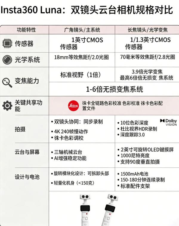 而Luna Ultra,作为双镜头旗舰版,搭载了广角加长焦双镜头独立系统,解决传统单摄口袋云台只能依赖数码裁切变焦,画质损失严重的痛点。