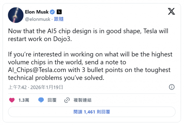 不过,马斯克最新的表态带来了转机。他明确指出,随着新一代AI5芯片设计已进入“良好状态”(in good shape),特斯拉将正式重启Dojo 3 的研发工作。这显示AI5 的成熟度直接促成了Dojo 项目的复活。