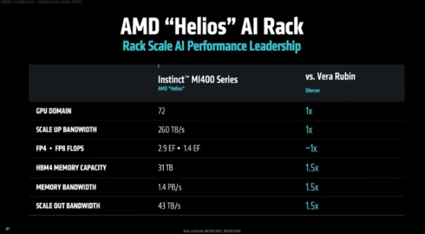 就 MI400 系列的整体预期而言,您将看到集成高达 432 GB 的 HBM4,这将带来巨大的带宽提升。此外,AMD 还计划通过 MI400 系列积极扩展其机架式选项,并推出备受期待的 Helios 机架式,据称其纸面规格可与 Vera Rubin 的顶级配置相媲美。因此,总体而言,AMD 预计将通过下一代产品线将其 AI 产品提升到一个全新的水平。