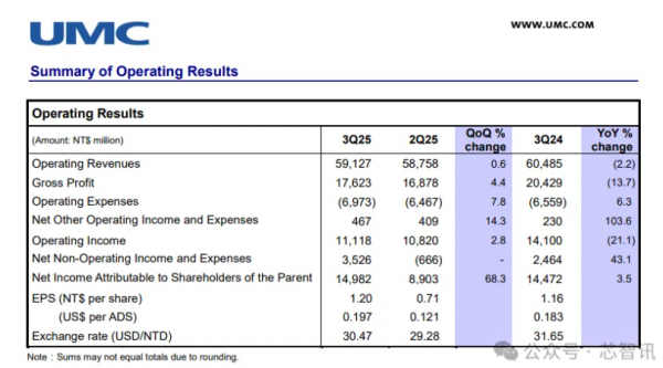 10月29日,晶圆代工大厂联电公布了2025年第三季财报,合并营收为新台币591.3亿元,较上一季的新台币587.6亿元增加0.6%,较2025年同期合并营收减少2.2%。2025年第三季毛利率达到29.8%,归属母公司净利为新台币149.8亿元,普通股EPS为新台币1.20元。