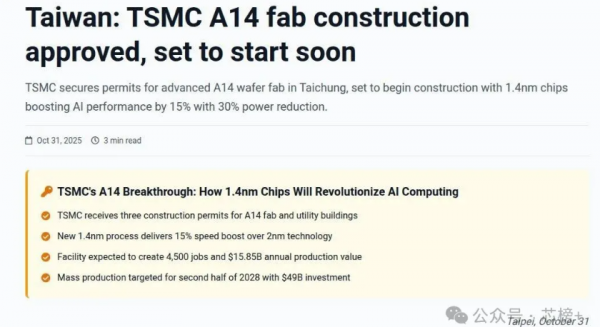 1、台积电获得A14工厂及附属设施的三张建造许可