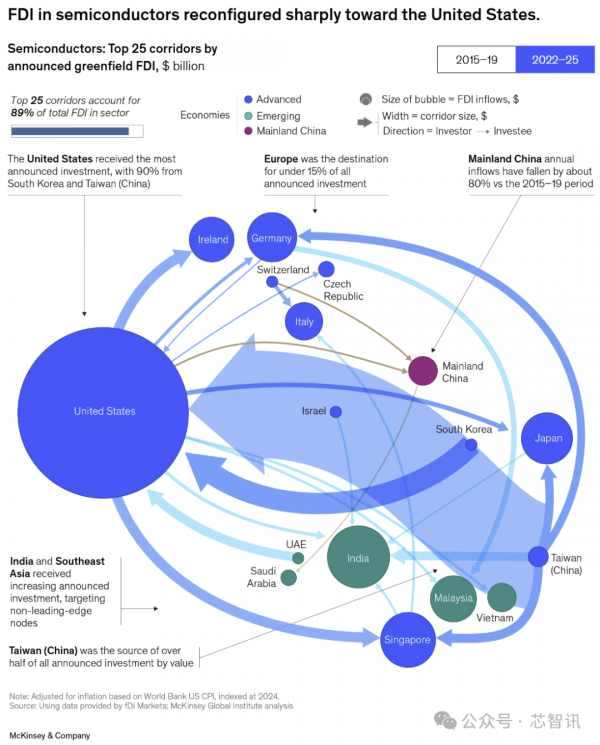 11月27日消息,据麦肯锡最新发布的一份研究报告显示,在美国特朗普政府上台之后,2025年半导体业的外国直接投资(FDI)有近90%流向了美国,且多由中国台湾、韩国企业推动。